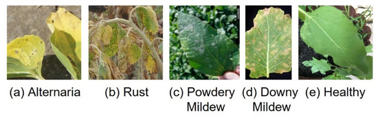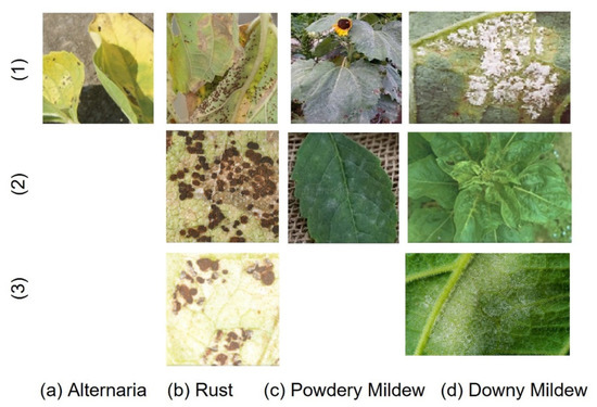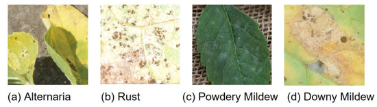 Of the four foliar diseases, rust and Alternaria are manifested by well-defined areas of the lesions produced, while downy mildew and powdery mildew can extend over the entire leaf. The use of these diseases in our study allowed us to evaluate the behavior of the system for both types of disease manifestations.