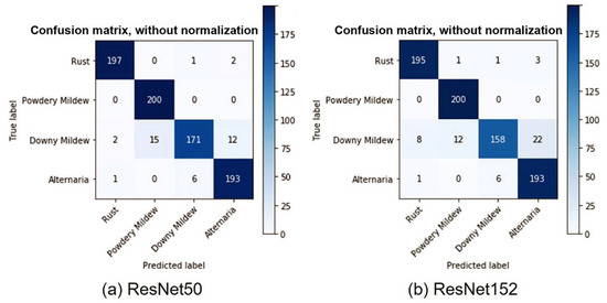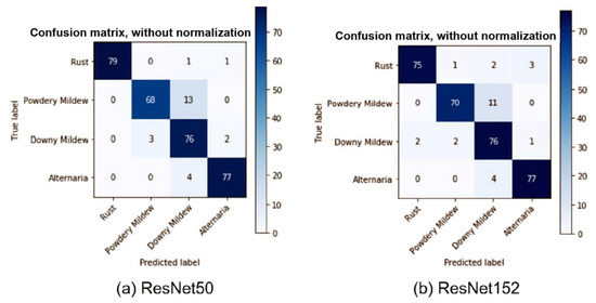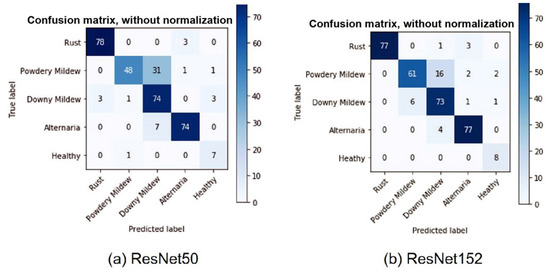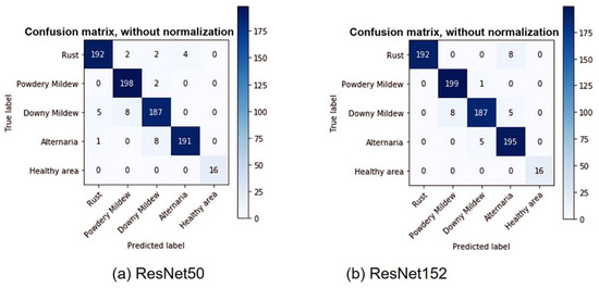 ResNet50 and ResNet152 were trained using the dataset from Table 1, with images containing leaves and background elements. The experiments were carried out initially without including the class of healthy leaves, and then adding this class as well. We wanted to study the impact that the healthy leaf class has on accuracy. The training metrics are presented in Table 3. A confusion matrix was created for each model and dataset combination. The results are presented in Figure 8 and Figure 9.