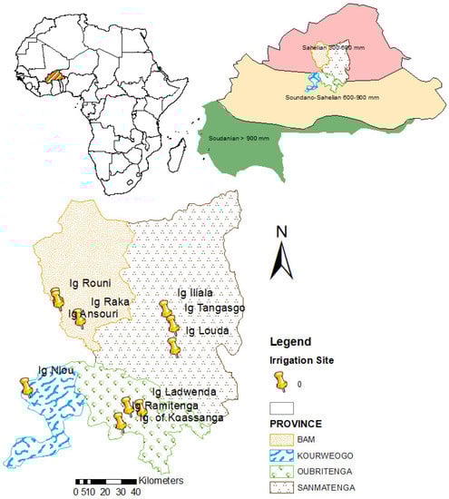 The ten sites of this study were first selected so as to capture the possible impact of certain climatic patterns and surface water resources in relation to water availability and reliability for irrigation (Table 1). It was also noted that nine of the 1 ha irrigation sites—namely, Rouni, Ansouri, and Raka in the province of Bam and Ilyala, Tangasgo, and Louda in the province of Namentenga—were chosen in the Sahelian zone, which experiences an exacerbated water scarcity, especially during the dry season (October to June). The remaining four irrigation projects—i.e., Ladwenda, Ramitenga, Kouassanga (province of Oubritenga), and Niou (province of Bam)—are situated in the North Sudanian zone, with a slightly higher rainfall but severe occurrences of dry spells (Figure 1). In addition, to increase the groundwater availability in flow and shallowness, half of the 32 wells were dug near surface water retention dams at distances varying from 115 to 1000 m.