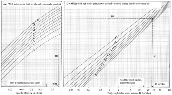 In the example, when computations in Equations (4) and (5) yield the well water layer at the beginning of the dry season H0 (7.5 m) and the piezometric natural variation during the dry season L (0.27 m/m), the curves to be used in the left and the right graphs are known. Then, the value of the specific flow Ce (0.82 m3/h/m) computed in Equation (7) allows drawing the segments “(a)”, “(b)” and “(c)”, leading to the determination of the well’s daily exploitable water Ve (26 m3/day) at the intersection of segment “(c)” and the Ve axis.