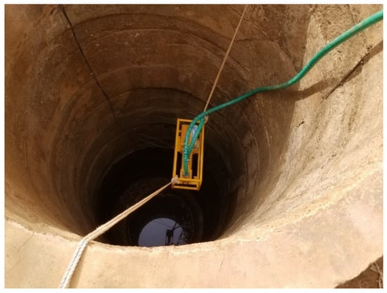 - Phase 2: Pumping. One should follow the descent of the water table during pumping using the probe at precise timesteps (every 10 min). The maximum pumping time is 3 h, and the well must be emptied until only a 1 m water layer remains. For the current study, solar pumps with an average flow rate of 2.44 m3/h were used. Because these pumps need sunshine, the recovery began at 9 a.m. to carry out the pumping between 11 a.m. and 2 p.m. This guaranteed a regularity of flow during pumping.