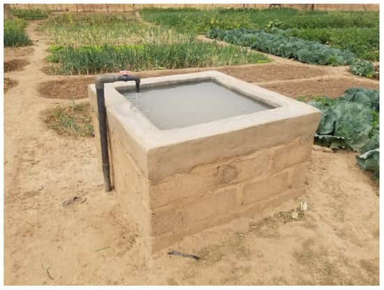 Similarly, the solutions provided by the BRACED project, aimed at alleviating the arduousness of the distribution of water to plants, were well appreciated by the farmers in the beginning, but they later showed their limits, leaving open the possibility for improvement. In fact, to solve the issue of arduousness, square basins of 1 m3 volume were built [28] to store the pumped water and allow its recovery by operators filling the watering cans, which would then be poured on the crops in the plots. The typical basin was a cement brick and mortar structure, with a surface area of 1 m2 delimited by low walls emerging about 1 m above the ground (Figure 5). The judicious distribution of a sufficient number of basins on 1 ha (between six and eight basins) undoubtedly reduced the travel time of the operators to the water from the well, but the work remained essentially arduous. In addition, it seemed that there was not enough communication with the operators—who were already making use of rustic ponds in market gardening—about a better way to build these basins. Field investigations and interviews with farmers indicated that the basins had three main weaknesses: (i) they required crossing an obstacle—the wall, which was 1 m high—to collect the water; (ii) they were not suitable for pregnant women; and (iii) they did not alleviate the arduousness of water transport by women farmers, who carried two watering cans at the same time at arm’s length and regularly complained of muscle and joint pain.