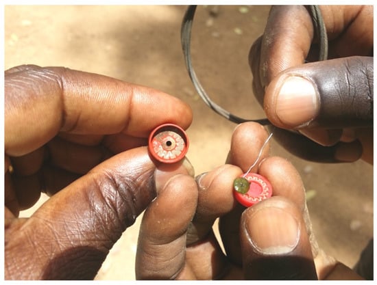 Although it was the most immediate, this difficulty was not the most serious of the low-pressure drip networks. The main problem was the threat to the sustainability of the system, namely, clogging [29]. Clogging in these networks was almost inevitable because of the low pressure, which favored the deposition of particles wherever the water velocity was low. This occurred even when the water was filtered and cleared of fine particles such as clays. From a well or even a borehole, the plug took the form of limestone or ferric iron precipitation [30] or the development of algae directly in the drippers (Figure 7). Even high-pressure (more than 4–5 bar) and well-filtered drip networks have this clogging problem, which is partly solved by (i) a decrease in risk from high pressure, (ii) a more complex filtration system that includes sand filters and disc filters, and (iii) the treatment of the network with commercial non-acidic anti-clogging agents to destroy algae and disperse clays [31]. It immediately appeared that such a filtration and maintenance device exceeded the current technical level of the farmer in the Sahelian zone. Thus, although drip irrigation technology was the subject of surprising publicity and enthusiasm, it seemed that the small farmers of the Sudano-Sahelian and Sahelian zones were not yet ready to adopt it [32]. On the other hand, while offering important advantages in terms of water saving (2 to 5 m3/(h·ha)), the microsprinkler is not as sensitive to clogging and does not require a complex frequency and level of maintenance. Furthermore, it can bring consistency to the shapes and colors of fruit, as well as create a milder microclimate in the dry Sahelian environment [33]. For more than 20 years (beginning in 1998), the International Institute of Water and Environmental Engineering (2iE) has been implementing an experimental space of 0.5 ha in Kamboinsé, where drip and microsprinklers are applied. The conclusions are clear: the experiment indicated that microsprinklers are a more sustainable and climate-suitable technology [34] for Sahelian small farmers if they are provided with a pressure of at least 1.5 bar and a sufficient water flow of at least 5 to 8 m3/(h·ha)—not from wells, but real boreholes in the crystalline basement rock.
