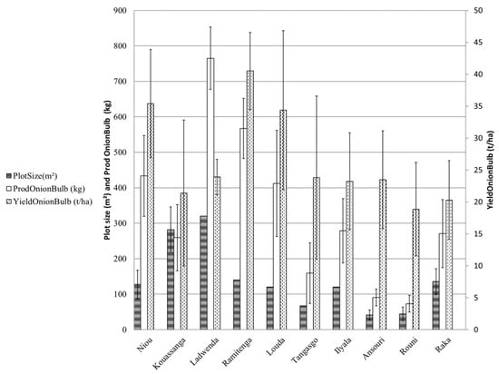 While onion bulb yields were good, production remained low across all irrigation schemes (Figure 8 and Table 3). To judge the quality of the yields, they were compared with those obtained at research stations or in the literature. The best yields reported in the literature on the onion bulb were 30 to 35 t/ha [35]. Average yields of 20 to 34 t/ha observed in the irrigation schemes, therefore, highlighted an excellent performance in terms of the productivity of the land unit exploited. The case of Ramitenga, with its 41 t/ha, is mentioned here because the production initially reported by the first person in charge of the grouping was exaggerated (double the values displayed in Table 3, in fact). Despite the limited water resources, this result can be explained by several factors. First of all, the producers present were, in fact, those who were the most motivated because they were not discouraged by the arduousness of the manual water distribution process, and they were more inclined to accept advice on technical matters relating to seeds, plowing, fertilizer applications, and harvesting. Then, because of the small size of the farm plots, 41 to 282 m2—barely the surface of a housing plot in Ouagadougou—control of the production factors was higher, as demonstrated by many studies [36]. The producers could have counted on significant production if the low areas had not only produced 73 to 400 kg of onion bulb per farmer in all 10 irrigation schemes. By way of comparison, an area of 1/5 hectares (or 2000 m2)—which is the most common farm plot area on irrigated developments downstream of dams in Burkina Faso [37]—with an onion bulb yield of 20 t/ha would lead to the production of 4 tons.