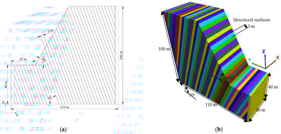 Considering the complexity of three-dimensional dynamic analysis and referring to the relevant results of dynamic analysis carried out by two-dimensional and three-dimensional numerical simulation, the adopted numerical model is shown in Figure 1. The slope angle α = 60° and the dip angle of rock layer β = 70°. The length*width*height of the model is 110*40*100 m, the slope height is 60 m, and the structural surfaces are equidistantly distributed with a spacing of 3 m.