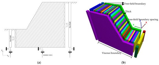 The dynamic analysis used in this paper is ξmin = 0.02 and ωmin = 5 Hz. The bottom of the model is set as a viscous (non-reflection) boundary, i.e., independent dampers are set at the bottom of the model in the normal and tangential directions, to provide viscous normal and tangential traction, respectively; the free-field boundary is used on all four sides of the model to simulate the free-field motion present but missing within the structure (Figure 2).