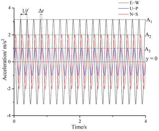 To more intuitively reflect the influence of the variation of each seismic wave parameter, the seismic wave in the form of a sinusoidal wave is selected for loading in this paper (Figure 3). The expression form of the sinusoidal wave three-way acceleration-time history is shown in Equation (8), and the corresponding velocity-time history is shown in Equation (9):