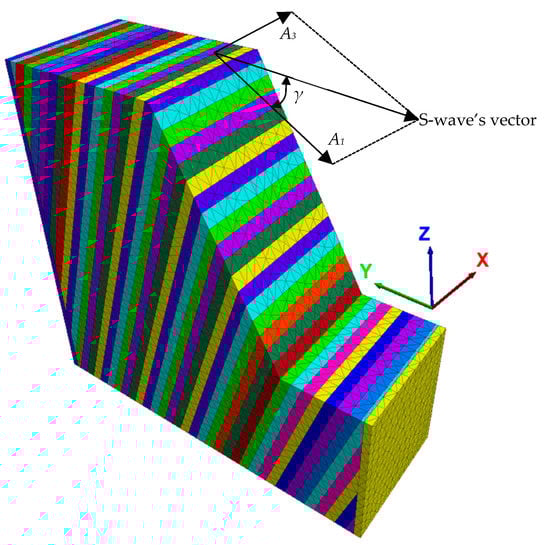 To comprehensively analyze the effects of seismic waves, five representative seismic wave parameters are selected for analysis in this paper: S-wave’s amplitude As, S-wave’s incidence direction γ, frequency f, holding time T, and time difference Δt between P-wave’s peak and S-wave’ peak. These are analyzed where γ is defined as the angle between the S-wave’s vector and the slope trend, and the geometric relationship is shown in Equation (12) (Figure 4):