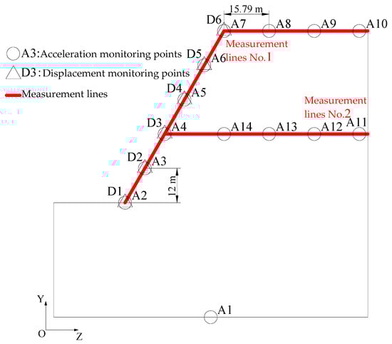 To analyze the effect of seismic wave parameters on the dynamic amplification effect and slope displacement of the slope under seismic action, 15 XYZ three-directional acceleration monitoring points and 6 XYZ three-directional displacement monitoring points are set up on the surface and inside of the slope in the process of dynamic analysis, which are located on two measurement lines to monitor the changes in three-directional acceleration and displacement with time, respectively, in the process of dynamic loading at the corresponding positions of the slope model. The distribution of their corresponding locations is shown in Figure 5. Among them, A1 is located in the center of the bottom of the model, which is used as a reference point to detect the peak acceleration of the seismic wave input to the model. A2-A10 and D1-D6 are equidistantly distributed on the measurement line No. 1, from the slope surface to the top of the slope, which is used to analyze the dynamic response law along the free surface of the slope. A4 and A11–A15 are equidistantly distributed on the measurement line No. 2, and their direction is parallel to the Y axis, from the slope surface of the model slope to the other side, which is used to analyze the dynamic response law inside the slope.