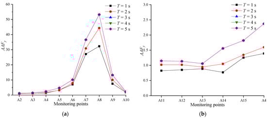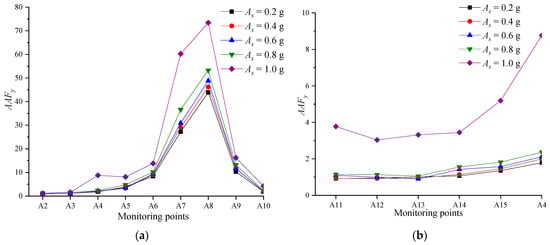 Keeping the remaining four parameters constant, the distribution of the slope amplification coefficient AAFy under the action of seismic waves with different S-wave amplitudes As is shown in Figure 6. The amplification effect of the slope shows an obvious positive correlation with the S-wave’s amplitude As. Figure 6a demonstrates that when As increases from 0.2 g to 0.8 g, the slope amplification effect of horizontal direction does not increase significantly; however, when As increases from 0.8 g to 1.0 g, the amplification effect of the upper part of the slope (three points A7, A8, and A9) increases significantly. This is related to the change of rock structure after the failure of the slope under the strong earthquake: the anti-dip slope has been destabilized by topping, and the bedding rock mass has become fractured, which objectively increases the diffraction of seismic waves in the rock mass and then leads to the exponential increase of the dynamic response.