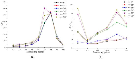 Keeping the remaining four parameters constant, the distribution of the slope amplification factor AAFy under the action of seismic waves with different S-wave incidence directions γ is shown in Figure 7. It can be observed from Figure 7a that, with the exception of a few points in the upper part, the variation of AAFy from bottom to top in the vertical direction of the slope with the value of γ is not significant, and it can be speculated that the amplification law of the slope from bottom to top in the vertical direction, i.e., the “elevation effect,” is only related to the P-wave, while the influence of the incident angle of the S-wave has less influence. Figure 7b shows that the magnitude of AAFy in the horizontal direction also shows a positive correlation with the value of γ. With the increase of γ to 36°, the law of the horizontal amplification effect of the slope no longer shows a single law of “surface effect,” but shows the rhythm of increasing, then decreasing, and then increasing again. This phenomenon demonstrates that the different incidence angles of the S-wave will directly change the wave propagation law in the rock mass, causing it to be more complicated and irregular, and thus it will no longer show a simple single correlation law.