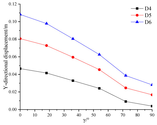 According to Figure 8, it is obvious that the Y-directional slope displacement is negatively correlated with the value of γ. After γ > 70°, the decrease rate of Y-directional displacement decreases as γ increases. When the incident direction of the S-wave coincides with the slope direction, i.e., γ = 0°, the force generated by the S-wave acts directly on the slope surface, thus the external force on the slope is stronger and the slope stability is lower. As γ increases, part of the seismic force generated by the S-wave is perpendicular to the slope direction, and its influence on the slope stability then decreases.