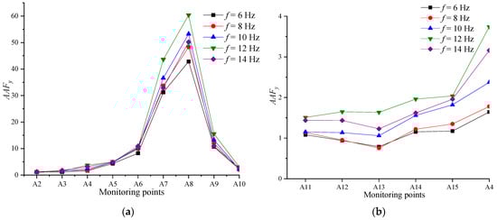 Distribution of acceleration amplification factor AAFy of the slope under different f: (a) measurement line No.1; (b) measurement line No.2.