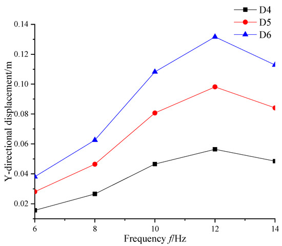 The distribution of Y-directional displacements at points D4, D5, and D6 under different f is shown in Figure 10. The slope-facing displacements increase and then decrease with the increase of seismic wave frequency f, and the extreme value appears at f = 12 Hz. This law coincides with the law of slope dynamic response obtained in Figure 9: at f = 12 Hz, the seismic wave frequency is close to the inherent frequency of the slope, the slope resonates, and the dynamic effect is the strongest. As a result, the displacement is the largest and the slope stability is the worst.