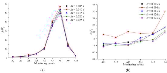 Keeping the remaining four parameters constant, the distribution of the slope amplification factor AAFy under the action of a seismic wave with different time difference Δt between the P-wave’s peak and the S-wave’ peak is shown in Figure 12. Figure 12 demonstrates that the value of AAFy at each point is the largest when Δt = 0.01 s; when Δt increases from 0.005 s to 0.025 s, AAFy increases and then decreases. The difference of Δt directly affects the propagation and superposition of the P-wave and the S-wave after incident on the slope, and then leads to the difference in slope dynamic response or amplification effect. Therefore, it can be inferred from the obtained results that when Δt = 0.01 s, the diffraction superposition of seismic waves reaches its peak, and the dynamic response of the slope is the strongest.