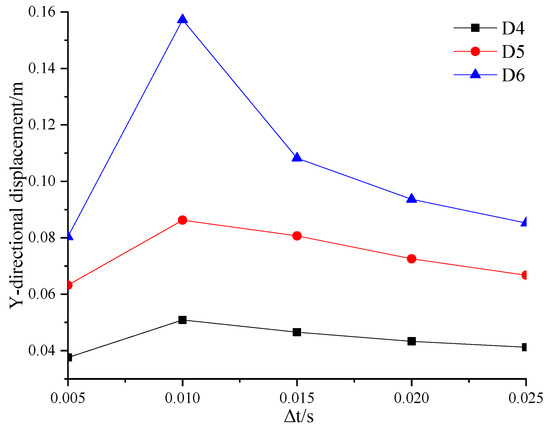 The distribution of slope Y-directional displacements at D4, D5, and D6 under different Δt is shown in Figure 13. Similarly, the slope-facing displacements increase and then decrease as Δt increases. This result confirms the rule reflected in Figure 12: when Δt = 0.01 s, the combined superposition effect of the P-wave and the S-wave is the strongest, and the dynamic response of the slope reaches the peak. At this time, the displacement produced by the earthquake is the largest and the slope stability is the worst.