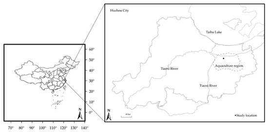 The study location is in the aquaculture-rich region of Huzhou City, Zhejiang.