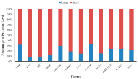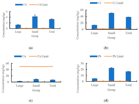 The concentrations of Cd, Cr, Cu, and Pb in both large and small black carp are given in Figure 2. In total, the concentrations of Cd, Cr, Cu, and Pb in black carp were 3.31 ± 0.04 mg/kg, 38.53 ± 0.47 mg/kg, 7.18 ± 0.10 mg/kg, and 16.69 ± 0.24 mg/kg, respectively. In large black carp, the concentrations of Cd, Cr, Cu, and Pb were 1.36 ± 0.04 mg/kg, 13.70 ± 0.50 mg/kg, 2.85 ± 0.10 mg/kg, and 4.98 ± 0.18 mg/kg, while in small carp the concentrations of Cd, Cr, Cu, and Pb were 4.27 ± 0.08 mg/kg, 50.84 ± 0.82 mg/kg, 9.33 ± 0.18 mg/kg, and 22.49 ± 0.42 mg/kg, respectively. In comparison to health concern limit values, the concentrations of Cd, Cr, and Pb concentrations were above the permissible level for human consumption, while the Cu concentration was lower than the limit value. Notably, the concentrations of each metal in large fish were lower than in small ones. This indicates that black carp may be easily contaminated by Cr, Pb, and Cd pollution. The degree of pollution and bioaccumulation appears to be directly related to the size of the fish.