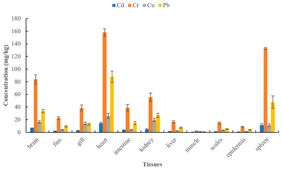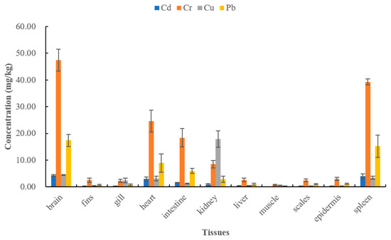 The concentration levels of Cd, Cr, Cu, and Pb in 11 different tissues of large black carp are presented in Figure 3, ranging from: