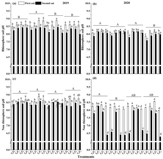 Under the same bacterial treatment, the soil pH value increased at the lower dose of P (P0–P2), while it decreased at the higher dose of P (P2–P3), from 2019 to 2020 (Figure 2). Under the condition of double inoculation of AMF and PSB bacteria (T2) in rhizosphere soil, the pH value (P2) at the phosphorus application rate of 100 mg kg−1, in 2019 and 2020, was significantly higher than that without phosphorus application (p < 0.05) (Figure 2a,b). From 2019 to 2020, the pH value of non-rhizosphere soil is similar to that of rhizosphere soil (Figure 2c,d). From 2019 to 2020, the soil pH value of the first cut is higher than the second cut.