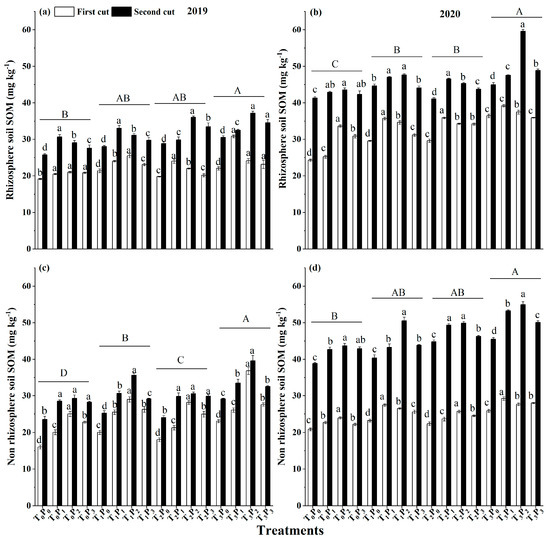 Under the same bacteria application conditions, the soil SOM content increased at the lower dose of P (P0–P2), while it decreased at the higher dose of P (P2–P3) (Figure 3). In the rhizosphere soil, under the condition of double inoculation of AMF and PSB bacteria, the SOM content of 100 mg kg−1 (P2) phosphorus application, in 2019 and 2020, was significantly higher than that of without phosphorus application (P0) (p < 0.05) (Figure 3a,b). In non-rhizosphere soil, under the condition of double inoculation of AMF and PSB bacteria, the SOM content of phosphorus application treatment was significantly higher than that of no phosphorus application treatment (p < 0.05). When the phosphorus application amount was 100 mg kg−1, the SOM content of the treatment with AMF and PSB was significantly higher than that of the treatment without bacteria application (p < 0.05).