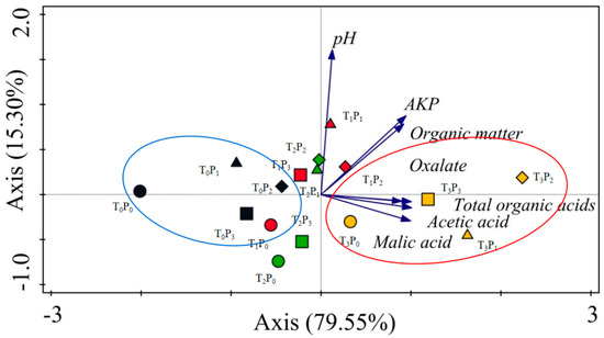 Based on the relevant analysis, we analyzed the main components of the total amount of alkaline phosphatase, organic matter, pH value in soil, malic acid, oxalic acid, acetic acid, and organic acid in the rhizosphere soil (Figure 4). The results showed that the variance contribution rate of axis 1 (Principal component 1, PC1) was 79.55%, that of axis 2 (Principal component 2, PC2) was 15.30%, and the cumulative contribution rate of PC1 and PC2 was 94.85%. Therefore, it can represent the original 7 indexes, the related indexes of PC1 were pH value in soil, organic matter, and AKP, and the indexes related to PC2 include malic acid, oxalic acid, acetic acid, and organic acid. The PC1 eigenvalues were sorted as T3P2 > T3P3 > T3P1 > T3P0. According to the characteristic value of each treatment on two factors and the contribution rate of the factor, the comprehensive evaluation model is Y = 0.796Y1 (PC1) + 0.153Y2 (PC2). The greater “Y” value indicates that the treatment has the best effect on soil fertility. The top three were T3P2 > T3P1 > T3P3 for processing.