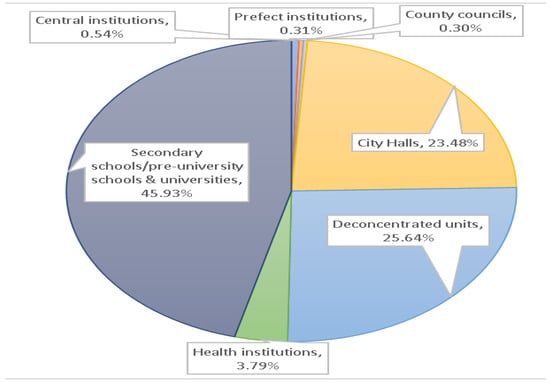 In Romania, the entire public sector consumes about 10% of the final energy amount and 25% of this energy is represented by electricity [22]. Public schools are important consumers of electricity. Thus, for example, in Romania the total number of public educational institutions, of which, 5% are universities, represents about 25% of the total number of public institutions [23]. This distribution is shown in Figure 1. Both public and private higher education universities generally have the same irregular footprint (pattern) of electrical consumption, due to the existing electrical equipment and systems in the laboratories, courses and application rooms, buildings for administrative staff, campuses and in dormitories and canteens, and to all of this is the addition of the important electrical consumption of modernization and maintenance works [24].