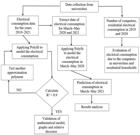 The methodology that is used in this study to estimate the impact of coronavirus lockdown on the electrical consumption of universities and residential households is presented synthetically in the flowchart that is in Figure 2.