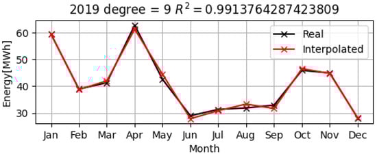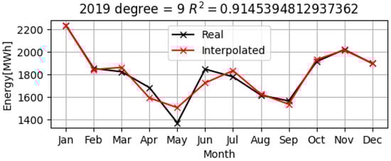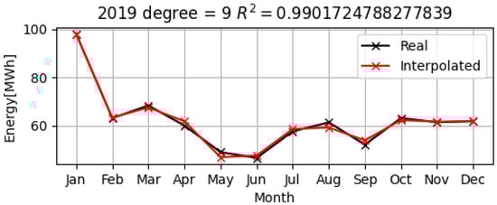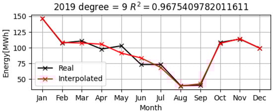 Below are the data of the measurements for the monthly electrical consumption of UDJG for the years 2019–2021, represented in black, as well as the obtained polynomial models of electrical consumption shown in red, in Figure 15, Figure 16 and Figure 17.