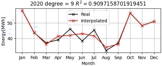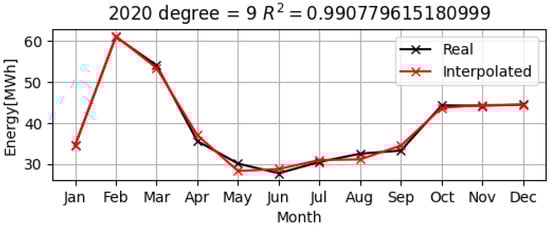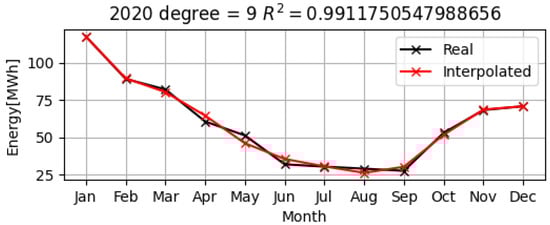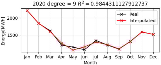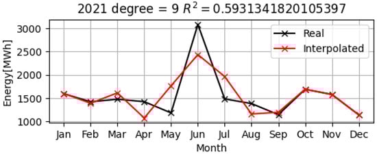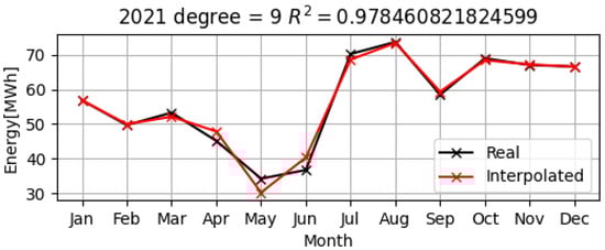 As can be seen in Figure 15, Figure 16 and Figure 17, the polynomial model (represented by the red lines on the graphs) is quite close to the real data for electrical consumption over the three years, 2019–2021. The values of R2 that are greater than 0.9, i.e., they are 0.96 and 0.99, respectively, have been calculated for all of the years, which demonstrates that the approximation by the nine-degree polynomial model is very accurate, as shown in Table 1.