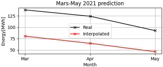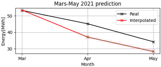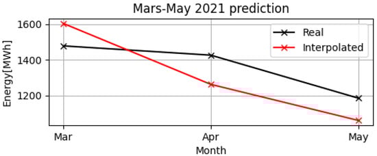 From March–May in 2020, the university education took place online and there were no exam sessions. Then, in a similar way, during the same months of March–May in 2021, the education also took place online. Therefore, considering the analogy of these periods during the two years of online education—2020 and 2021—a prediction of electrical consumption was made. By using the “polyfit” function, the polynomial (predicted) model of electrical consumption was created for March–May in 2020 and it was compared with the real electrical consumption of the same period in 2021. In Figure 6, the monthly electrical consumption of the predicted model from March–May in 2020 is represented in red, whereas the real data from the same period in 2021 is in black.