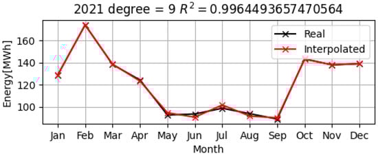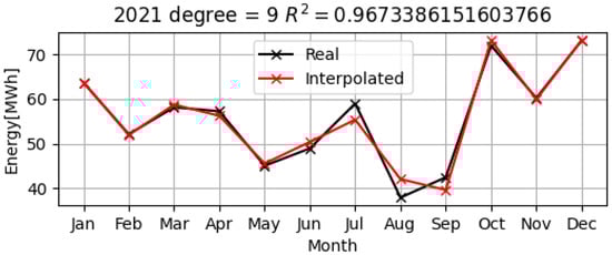 As can be seen in Figure 11, Figure 12 and Figure 13, the polynomial model (represented by the red graphs) is quite close to the real data for the electrical consumption over the three years, 2019–2021. For 2019, the residual sum of the squares between the real values and those obtained from the model (SSres) was approximately 55.44, while the total sum of the squares (SStot) was 790.89. For the year 2020, it was SSres = 63.92 for an SStot = 707.99, and for the year 2021, it was SSres = 44.08 while SStot = 1349.70. The polynomial approximations of the electrical consumption for the years 2019–2021 are of degree 9. For example, the polynomial model of total electrical consumption of UPIT in 2021 is: