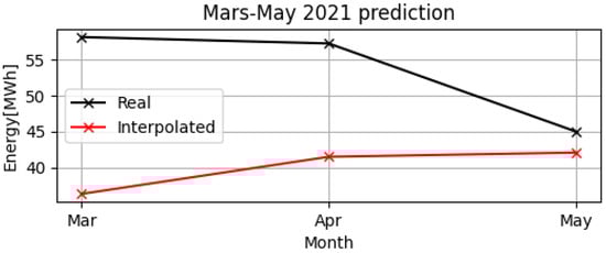 Figure 10 shows the monthly electrical consumption polynomial model from March–May in 2020 in red, respective to the real electrical consumption in the same period in 2021 in black. The trends start at different points in March, wherein the predicted value is smaller than that of the real one. Near the middle of March, the two trends intersect, and then the real electrical consumption values become higher than the predicted ones do, reaching a difference of 219 MWh in April and of 148 MWh in May.