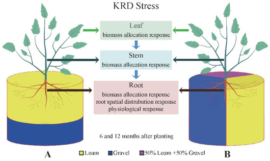 Dalbergia odorifera T. Chen (D. odorifera) is a tall leguminous, woody plant that can fixate nitrogen and improve soil quality. It has high medicinal and timber values. Heartwood of D. odorifera is most precious among the 29 species of mahogany in China GB/T18107-2017. It is also a valuable traditional Chinese medicine known as “Jiangxiang”. It has antioxidant, cardiovascular protection, anti-thrombotic platelet aggregation, anti-inflammatory, anti-allergic, central nervous system inhibition, anti-tumor, antibacterial, hypoglycemic, tyrosinase activation, prevention of photoaging, inhibition of osteoclast formation, anti-osteoporosis, and other pharmacological effects [39,40,41]. D. odorifera is suitable for KRD areas, with high average annual net productivity [42]. As reported by Zhou et al. [43], it can improve the soil nutrient status and increase the soil phosphorus availability in KRD areas. Here, we studied the potted seedlings of D. odorifera under simulated SKF-S habitats. We performed a comparative analysis of growth, biomass allocation, spatial root distribution, morphological characteristics, and physiology under these conditions. The adaptive response of the D. odorifera root system to the SKF-S habitat was further elucidated. Our findings can provide more reasonable strategies and references for ecological restoration in KRD areas.