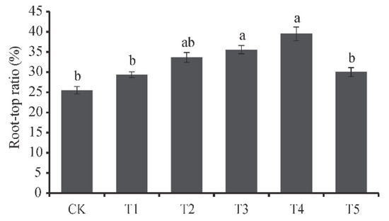The root to shoot ratio of D. odorifera reached its maximum in T4, at 39.50%, which was significantly different from the CK, T1, and T5, and not significantly different from the other treatment groups (Figure 2). With the decrease in topsoil thickness, the root to shoot ratio increased gradually.