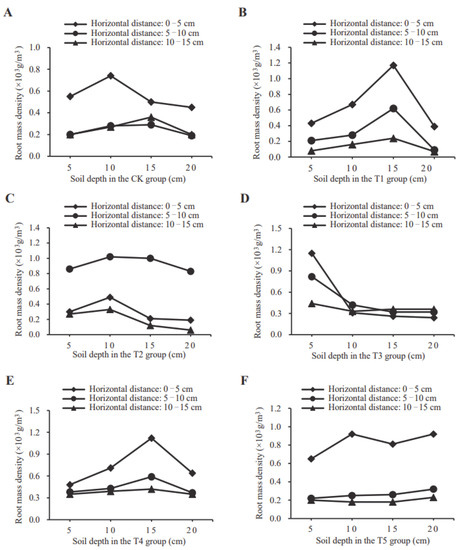 In T5 (Figure 3F) the root weight density in the 10 cm soil layer reached its maximum at a distance of 0–5 cm from the tree trunk. Still, there was no significant difference compared to other soil layers. The distribution and development trend of roots at 5–10 cm and 10–15 cm away from the trunk in the different soil layers were the same. Thus, it can be concluded that D. odorifera root biomass was evenly distributed in the vertical direction in the fan-shaped matrix.