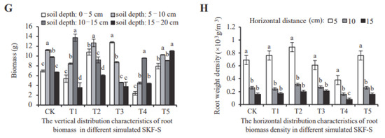 Spatial distribution indexes of root weight density in CK (A), T1-T5 (B–F), biomass of D. odorifera seedlings in different soil depths in different simulated SKF-S (G), and root weight density at different horizontal distance in different simulated SKF-S (H). Different letters represent significant difference (p < 0.05) between different soil depths and horizontal distances in each group.