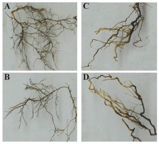 The activity of peroxidase (POD) and superoxide dismutase (SOD), the content of soluble proteins and soluble sugars, and the root activity were determined. In short, the concentrations of superoxide dismutase (SOD) and peroxidase (POD) were determined according to the method of Sofo et al. [44]. The soluble protein content was determined according to the Bradford method described by Luo et al. [45]. The soluble carbohydrate content was determined according to the anthrone method described by Yemm and Willis [46]. Root activity was determined according to the method described by Zhang et al. [47].