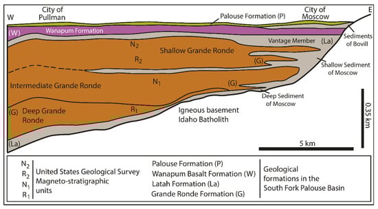 - Bush, J.H.; Garwood, D.L.; Dunlap, P.; Lewis, R.S.; Schmidt, K.L. Geology and geologic history of the Moscow-Pullman basin, Idaho and Washington, from late Grande Ronde to late Saddle Mountains time. In Exploring the Geology of the Inland Northwest; Lewis, R.S., Schmidt, K.L., Eds.; Geological Society of America: Boulder, CO, USA, 2016. [Google Scholar]
