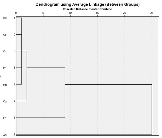In the case of plants, CA results show that pollutants are divided into four clusters based on similarities: (I) Zn; (II) Cu; (III) Fe-Co; (IV) Mn; and (IV) Cr-Pb-Cd. Cluster 1 is occupied by Zn, and it is associated with clusters II (Cu) and III (Figure 2). This revealed a common source of pollution for all of the HMs. Cluster III (Fe-Co) is partially associated with Cluster II (Cu) and demonstrates that hazard metals have a common anthropogenic source. Meanwhile, Cd, Cr, and Pb appear to derive from sources other than Zn, Fe, and Cu, and exhibit other organic fertilizer sources.
