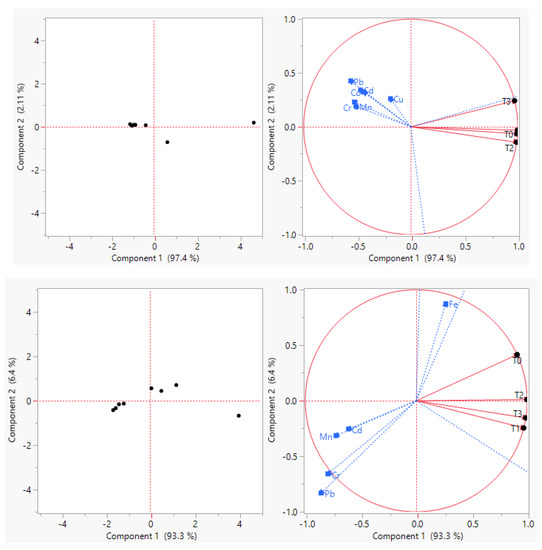 PC1 explained 97.4% of the total variance and was significantly positively loaded with Zn and Fe (in the first rotated matrix); Cu in the second rotated matrix and correlated with T1: poultry waste (PW), T2: press mud (PM). PC2 explained 2.11 percent of the total variance and was found to be significantly correlated with Cd, Co, Cr, Pb, and Mn. PC1 explained 93.3% of the total variance in C. sativum and was significantly positively loaded with Zn (in first rotated matrix) and correlated with T1 and T3. Fe, Co, and Cu are in the second rotated matrix and are correlated with T3. The PC2 explained 6.4 percent of the total variance, was significantly correlated with Cd, Cr, Pb, and Mn, and had a negative correlation with pollutant source (Figure 3).