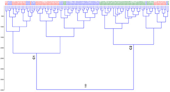 The MseI+AGA/EcoRI+CAG combination was the most informative, with 143 unambiguous fragments. The data matrix was used to detect the amount of molecular variance (AMOVA) among (21%) and within (79%) populations, whose sizes are typical of an outbreeder species. The dendrogram of the cluster analysis graphically represents the genetic relations among individuals belonging to the three populations (Figure 1). The robustness of the dendrogram was based on a bootstrap analysis, but only the first node was found to be statistically significant (100%). As a result, the dendrogram clearly identified two main groups: the upper one (C1) is made up of samples collected at Monte Corvo and Monte Focalone sites, and the lower group (C2) was basically made up of samples collected at Monte Portella. The homogeneity of C1 was very high, as all individuals were from MC and MF sites, except two from Monte Portella (namely MP04 and 09), whereas in C2 the homogeneity was lower, with nine samples from Monte Focalone (namely MF01, 21, 04, 12, 08, 16, 30, 28, and 37) and two from Monte Corvo (MC06 and 25). The bootstrap values of subclusters C1 and C2 were as low as 2%, indicating that the arrangements of individual genotypes within each of them was of no importance.