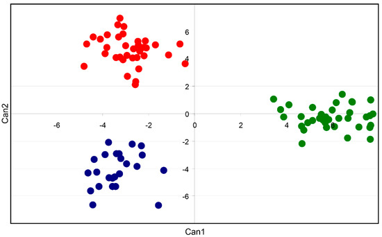 Scores of 118 individuals of A. eriantha from Monte Corvo (blue), Monte Focalone (red), and Monte Portella (green) obtained after the canonical discriminant analysis (Can1 = canonical function 1, 59%; Can2 = canonical function 2, 4%).