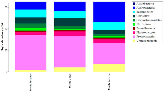 To analyze the contribution of the principle ASVs at several taxonomic levels (phylum and genus), we filtered data (1% cut-off) and described them with taxonomy barplots. At the phylum level (Figure 4), Proteobacteria was the most common phylum in all samples but with different abundances. The samples from Monte Focalone and Monte Corvo showed higher abundances than those from Monte Portella, with 40% and 36%, respectively, compared to the 24% of the latter. Actinobacteria and Acidobacteria showed similar abundances in all samples, being greater than 10%. Finally, Bacteroidetes, Chloroflexi, Gammatimonadetes, Nitrospirae, Patescibacteria, Planctomycetes, and Verrucomicrobia also showed comparable abundance in all samples but with percentages less than 10%.