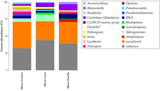Figure 5 depicts the ASV abundances at the genus level. The uncultured and unknown ASVs emerged in the abundance of all the samples, with percentages over 30%. Candidatus Udaeobacter, Haliangium, and RB41 were present in all samples, with higher abundance in those from Monte Portella. Monte Focalone and Monte Corvo shared the CL500-29 marine group and Sphingomonas. Iamia and Nitrospira were common in Monte Focalone and Monte Portella. Blastocatella was present in Monte Corvo and Monte Portella. Moreover, the results also showed the presence of unique genera in each sample. Aeromicrobium, Lysobacter, and Pseudoxanthomonas were present exclusively in Monte Focalone. Ellin6067, Opitutus, Pseudonocardia, and Rhodoplanes occurred only in Monte Corvo, while Bryobacter, Solirubrobacter, and Streptomyces were solely found in Monte Portella.