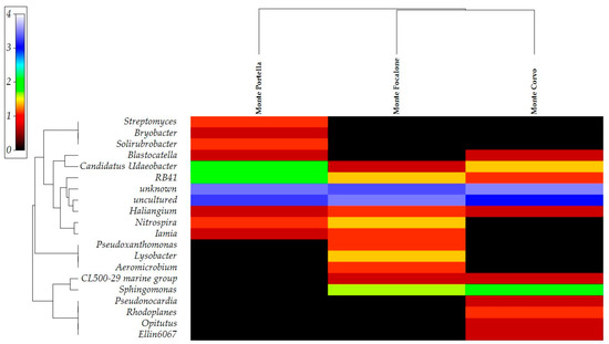 The heatmap based on the main relevant genera for presence/absence and abundances to highlight different correlations between the samples is reported in Figure 6. The output described the clusterization of two different groups. One cluster was formed by Monte Focalone and Monte Corvo samples and one by the Monte Portella sample. This grouping can be explained due to the stronger correlation of the microbial communities found in the Monte Focalone and Monte Corvo samples according to Sphingomonas and CL500-29 marine group abundances. Still, the higher correlation of unique genera found in Monte Portella (particularly Streptomyces and Solirubrobacter) led to this location being grouped separately from the other two. Moreover, the relevant abundances of uncultured and unknown genera contributed to decreasing the differences between samples as showed by a reduced distance in the clusters.