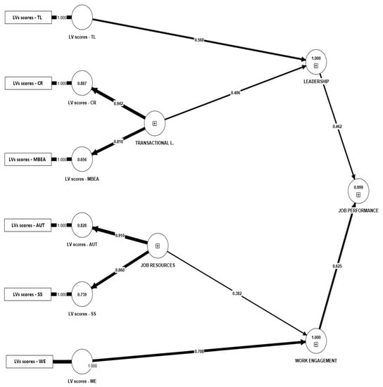 As for designing our measurement model in SmartPLS, we determined if the relationship between the given indicators within our model best specified as formative or reflective. Since by default, SmartPLS displays a reflective measurement mode in the case of all the proposed latent variables, we ran a Confirmatory Tetrad Analysis (CTA-PLS), as suggested [110]. This type of analysis can only be used for the latent variables that have at minimum of four indicators associated. For the current case we tested for all the latent variables, except CR, MBEA, AUT, and SS. Results show job resources, TL and WE to be formative, whether leadership, transactional leadership, and work engagement to be reflective. By analyzing the p values, the literature suggests that for p < 0.05 the threshold for significance values indicate that it is best formative, while if p > 0.05 (unsignificant), then it is reflective. It is important to mention that the threshold for p values is 80%, meaning that if 80% of the p values are significant for a given dimension, then it is formative, while if the threshold of the p values is non-significant, then it is reflective.