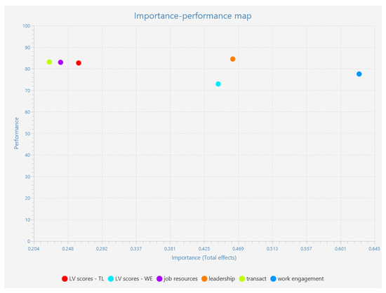 Since job performance is influenced by an abundance of factors, an effective practice of a given leadership style would result into an increase in regard to one’s job performance, therefore as previously claimed [135] the adoption of a particular leadership style results in a refining of the abilities of followers for attaining job performance. Leadership and its two components only qualifies for a central position on the importance and performance map (close to 45% in importance; therefore, lower that work engagement), and >80% in performance (slightly higher than work engagement results). On another side, transactional leadership alone keeps its status in importance but scores lower in performance. By adding and subtracting these effects, results bring into light once again the importance of the transformational leadership instruments (online) adapted, that is highly appreciated by followers, despite educational, geographical, or organizational backgrounds. Transformational leaders treat followers on an individual level by encouraging their individual aspirations, considering individual needs, and encouraging developing one’s abilities.