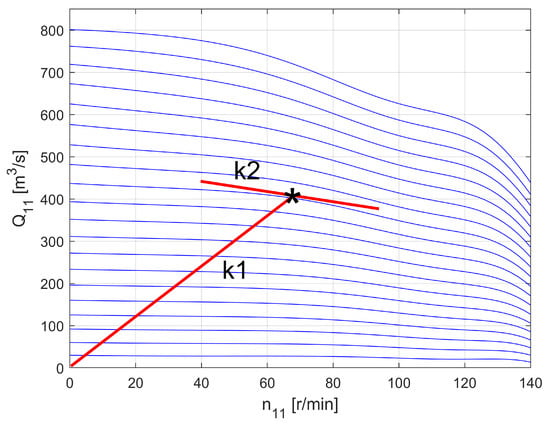 where the impedance is highly related to the characteristic curves of the hydraulic turbine. n and D1 are the rotational speed and runner’s diameter, respectively. n11 and Q11 denote the unit rotational speed and unit discharge, respectively.