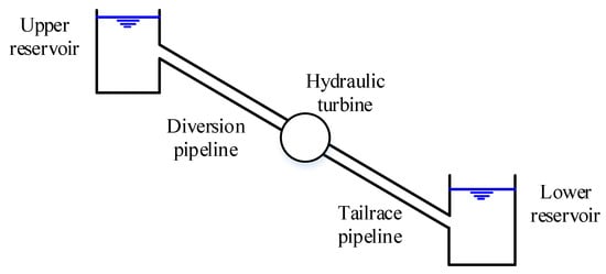 The system is composed of an upstream reservoir, a diversion pipeline, a hydraulic turbine, a tailrace pipeline, and a downstream reservoir. The equivalent circuit of the hydropower station system is illustrated in Figure 4. The essential parameters of the pipeline system in the hydropower station are given in Table 1.